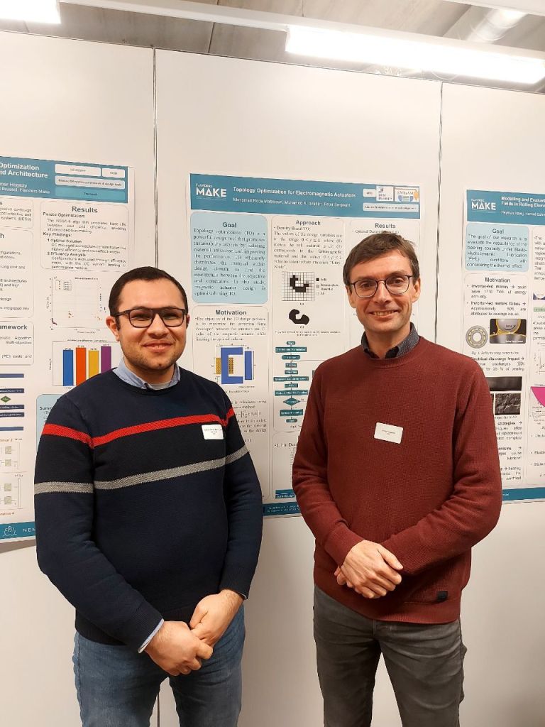 At the Flanders Make 5th Scientific Conference for Machines, Vehicles and Production Technology doctoral candidate Mohamed Reda presented a poster on “Topology optimization for electromagnetic actuators”. At the event in Leuven, Belgium he was accompanied by scientific supervisors Prof. Sergeant and Dr. Ibrahim of University of Gent.